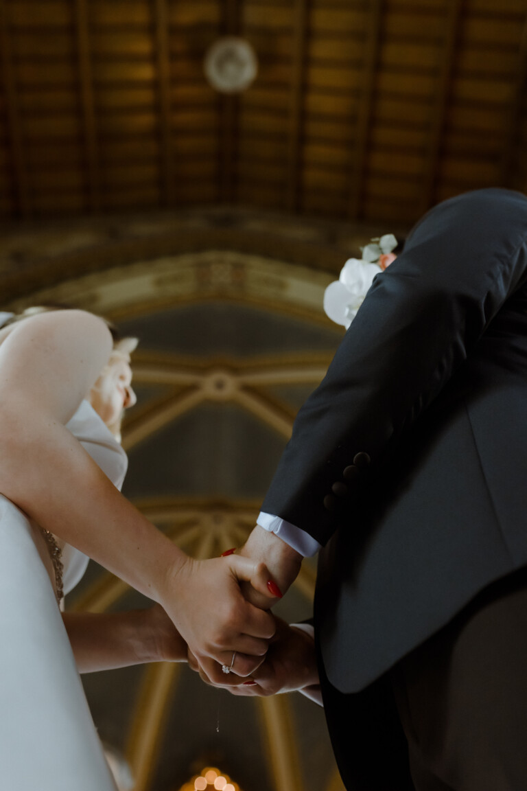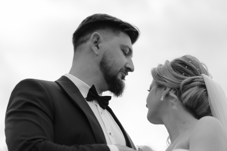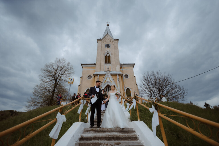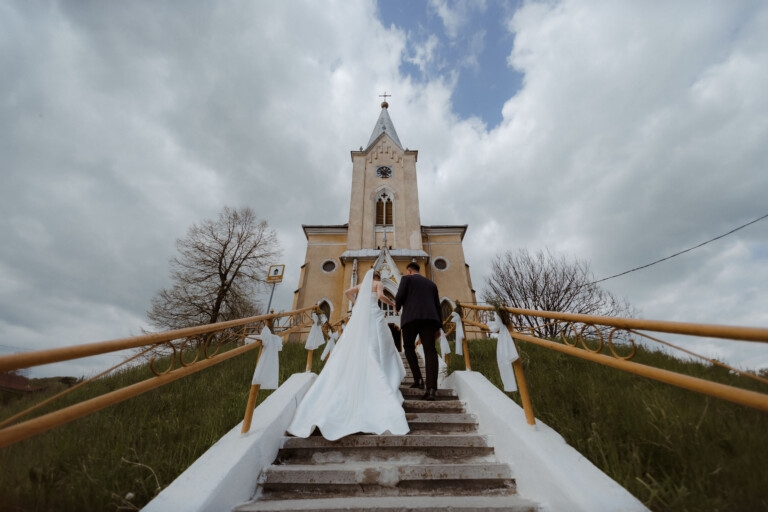 Ceremonia din umbra unei biserici impunătoare, cu scări elegante care duceau spre intrare, a fost ca un capitol nou al unei povești vechi și nobile. Lumina îi învăluia pe cei doi, oferind o atmosferă plină de emoție în timp ce promisiunile lor de iubire se faceau auzite.